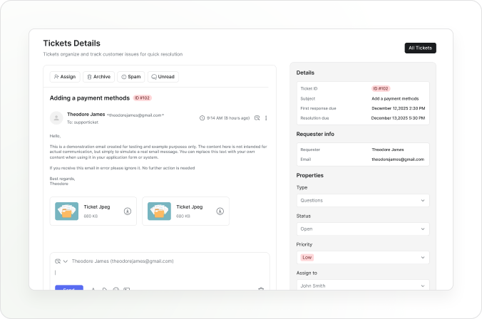 Add teammates, assign ownership, and collaborate on tickets and replies without losing context.
